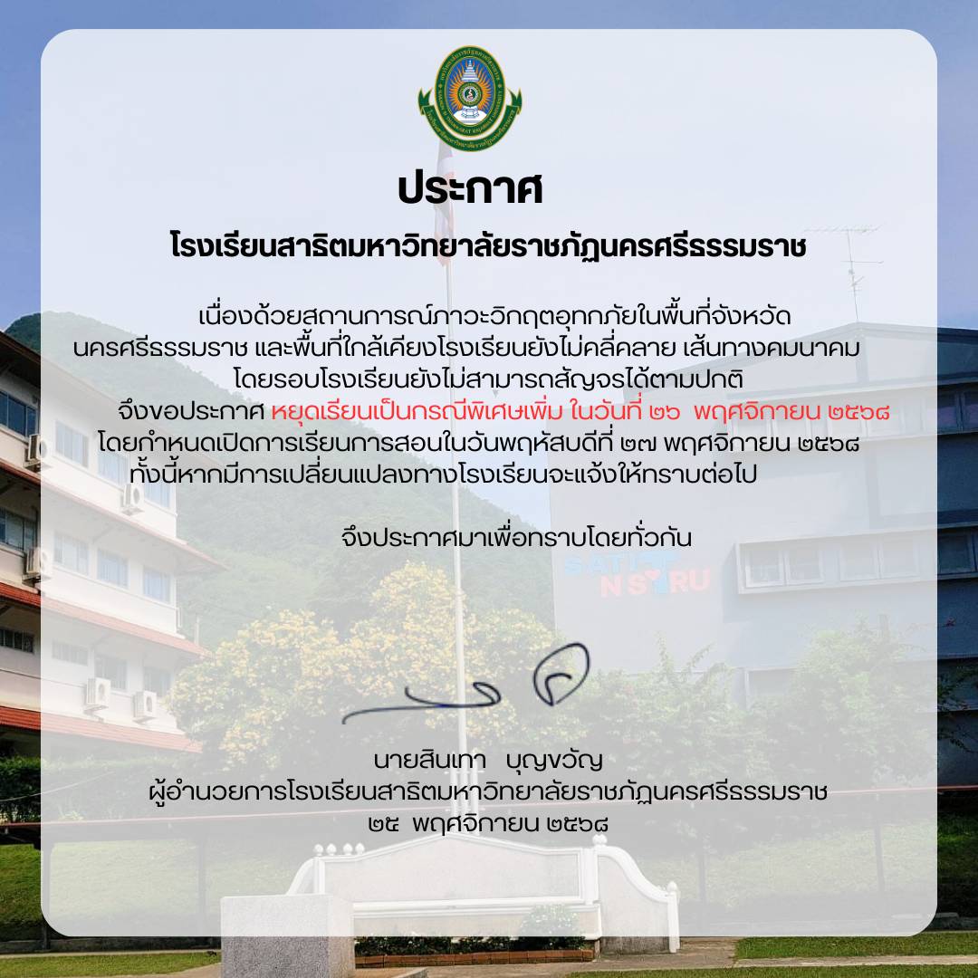 📢ประกาศ โรงเรียนสาธิตมหาวิทยาลัยราชภัฏนครศรีธรรมราช📢 🌧️🌧️ หยุดเรียนเป็นกรณีพิเศษ(น้ำท่วม) วันที่ 26 พฤศจิกายน 2568 และเปิดเรียนตามปกติ ในวันพฤหัสบดี ที่ 27 พฤศจิกายน 2568 🌧️🌧️